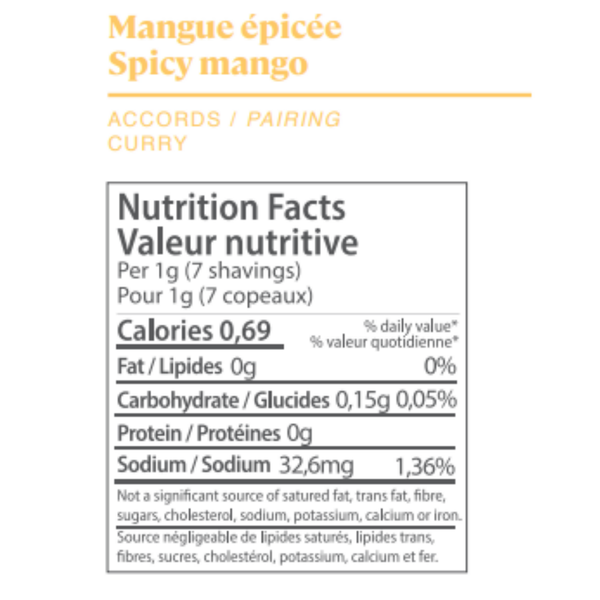 Mango puree, apple cider vinegar, salt, Agar-agar, natural Mango flavour, water, gluten free tamari, brown sugar, curry, onion powder, locust bean gum, ginger powder.